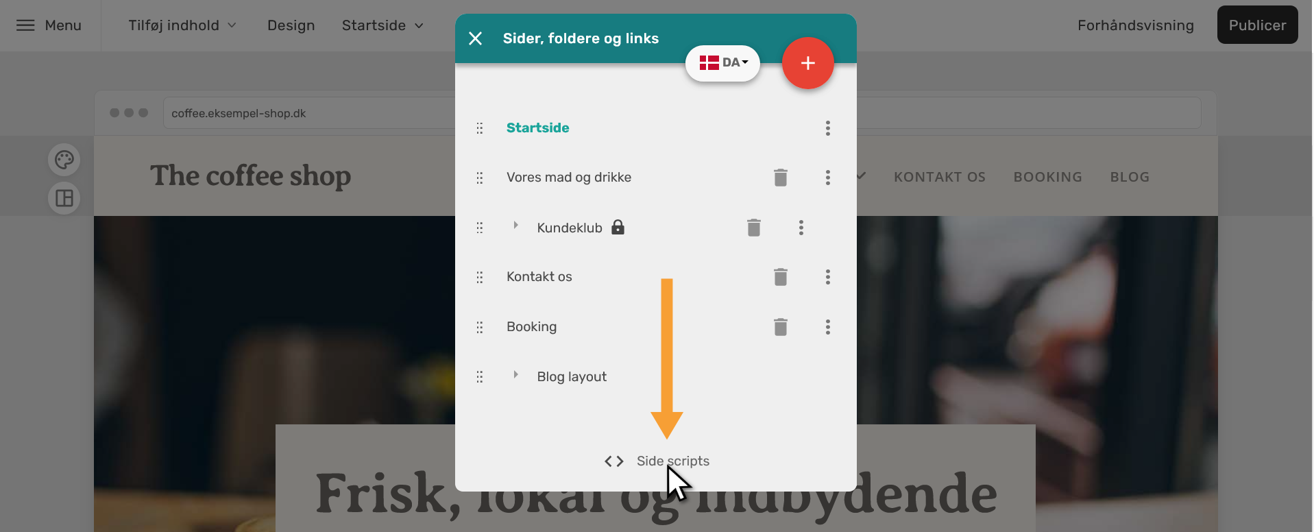- INTEGRER: Her skal du klikke for at kopiere integrationskoden til din hjemmeside.