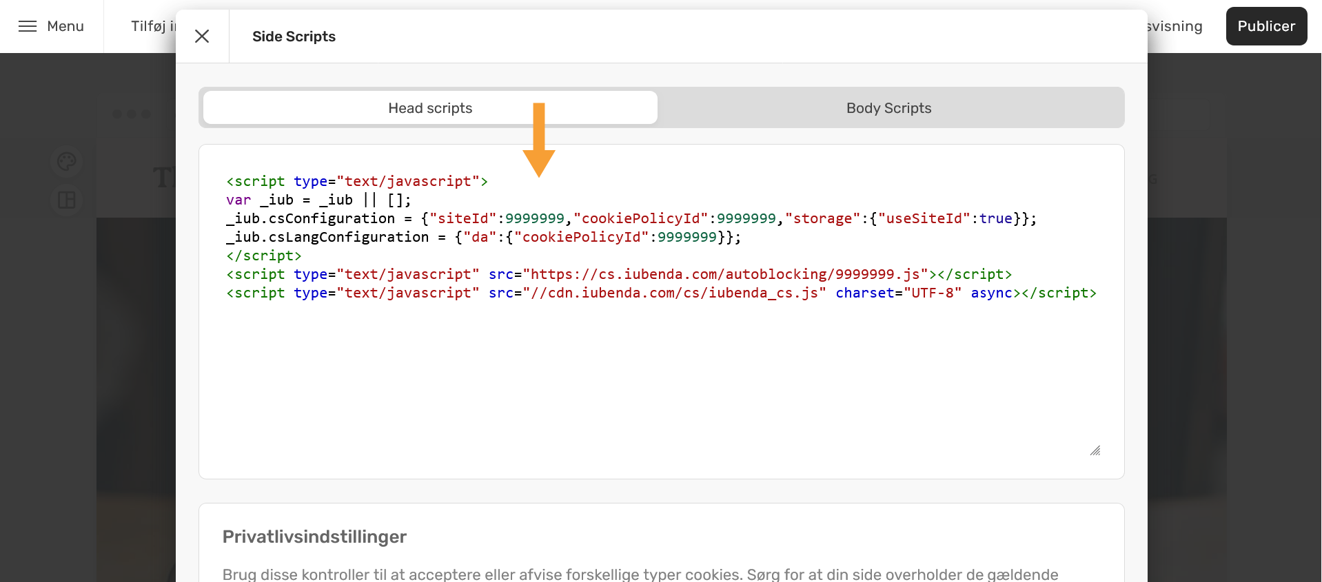 - Indsæt WayWidget koden i feltet Head scripts: